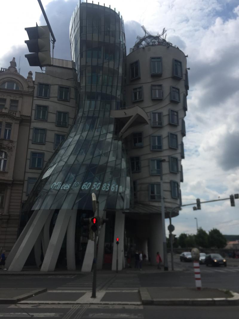 Bir kadınla dans eden bir adamı tasvir eden bu enteresan bina, günümüzde Dancing House (Dans Eden Ev) olarak anılmakta. Yapımı 1996 yılında tamamlanmış, çevredeki modern ilk ev olduğu için ilk başta tarihî dokuyu bozduğu gerekçesiyle karşı çıkılmış. Ancak günümüzde turistler tarafından çok ilgi gördüğündan, sonraları kabullenilmiş. Şaşırtıcı olan özelliğiyse, binanın aslında ofis olması.