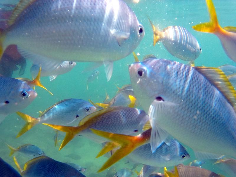 Balıkları beslenmeye alıştırmışlar. Miço eliyle ekmek atıyor ve tüm balıklar etrafımızda yüzmeye başlıyor.