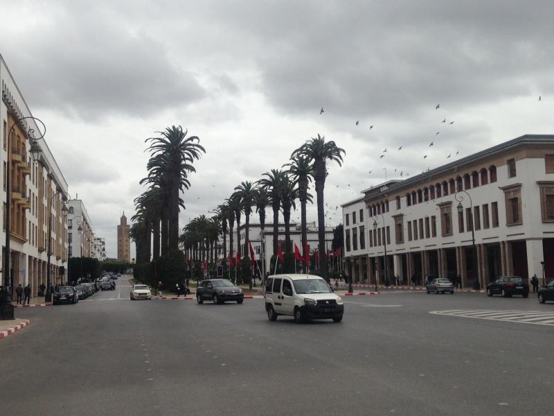 Avenue Mohammed V). Caddenin alt ucundan baktığınızda orta refüjde yol boyu yerleştirilmiş Fas bayrakları ve caddenin sonunda görülen Cami (