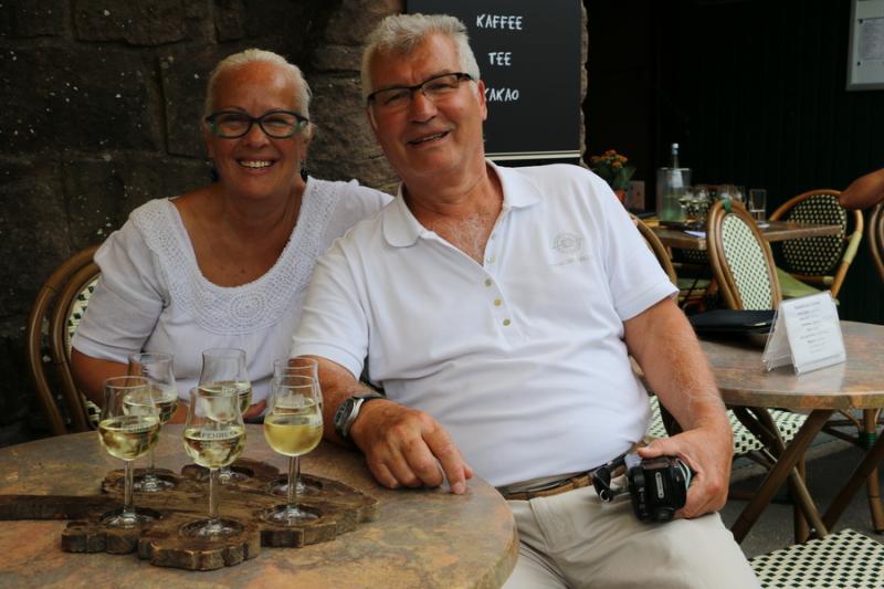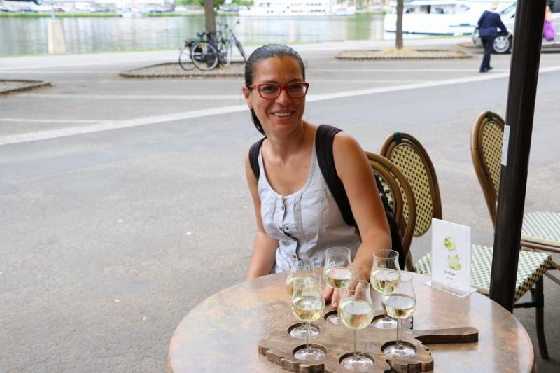 Bu tarafta da gezimizi tamamladıktan sonra gemiye doğru dönerken bir şarap mahzeninde duraklıyoruz. Burada 6 Euro karşılığında 6 farklı çeşit şarap deneyebiliyorsunuz. Şarapları sundukları tepsiyi asma yaprağı şeklinde yapmışlar. Size tadımlık 6 kadeh şarap yanında bir de üzerinde numaraların ve şarapların isimlerinin yer aldığı bir liste veriyorlar. Yanlarında da fiyatları var. Burada hem şarap tadımı yapıp hem de sipariş verebiliyorsunuz.
