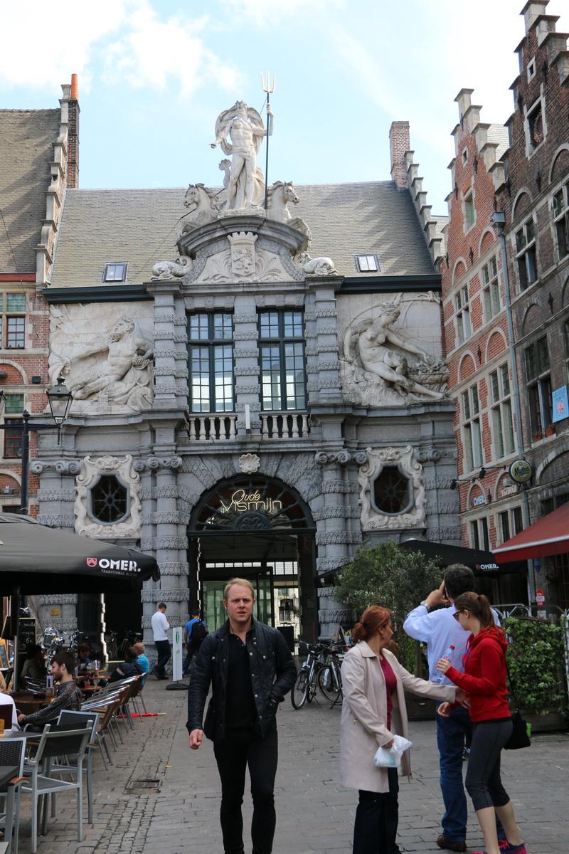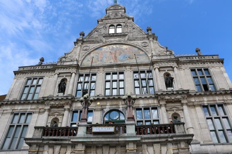 Akrobat figürlerini fotoğrafladıktan sonra yolumuza devam ederken belediye binasını görüyoruz. Binanın arka tarafı İtalyan Rönesans mimarisi, ön tarafı 16. yüzyıl Flaman Gotik tarz ile inşa edilmiş.