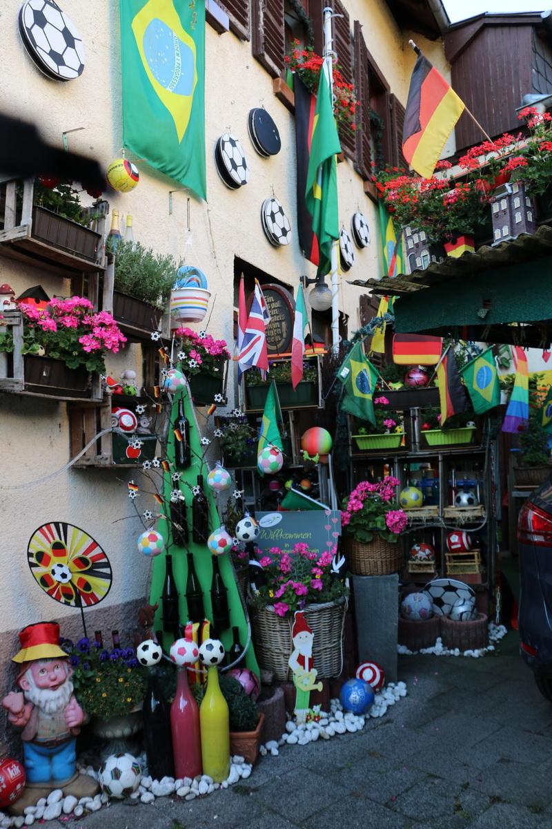 Biraz sokak aralarında dolaştık. Şarap bağı havası yaratılmış restoranlar, İşkence Müzesi, hediyelik eşya dükkânları dikkat çekiyor. Benim ilgimi en çok çekenlerden biri ise futbol fanatiği bir Rüdesheimli’nin evinin bahçesi oldu.