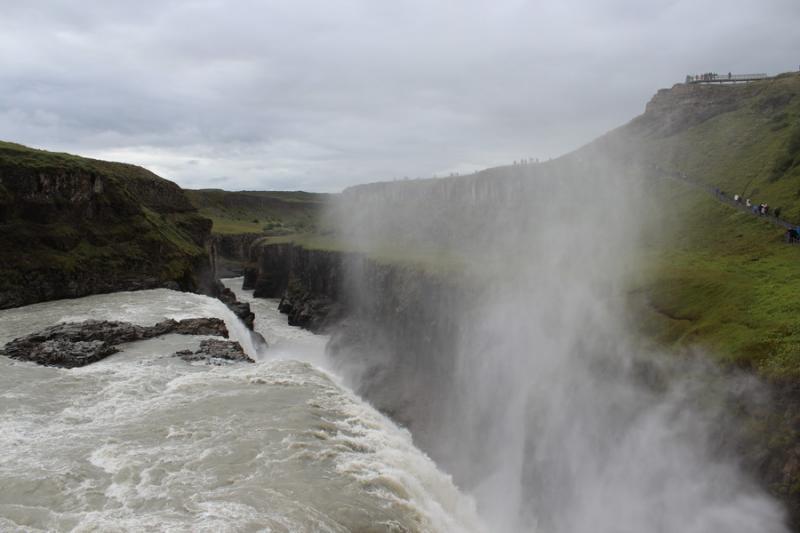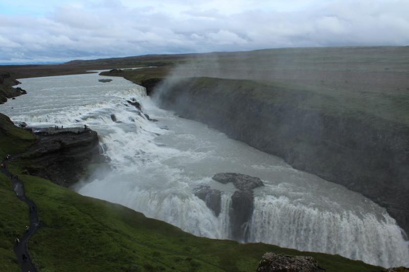 Gelelim Gullfoss Şelalesi’ne… Bu şelale de İzlanda’daki pek çok diğer şelale gibi buzullardan besleniyor. Daha şelaleyi görmeden şelaleden yükselen su buharlarını görebiliyor ve şelalenin gürül gürül sesini duyabiliyoruz.