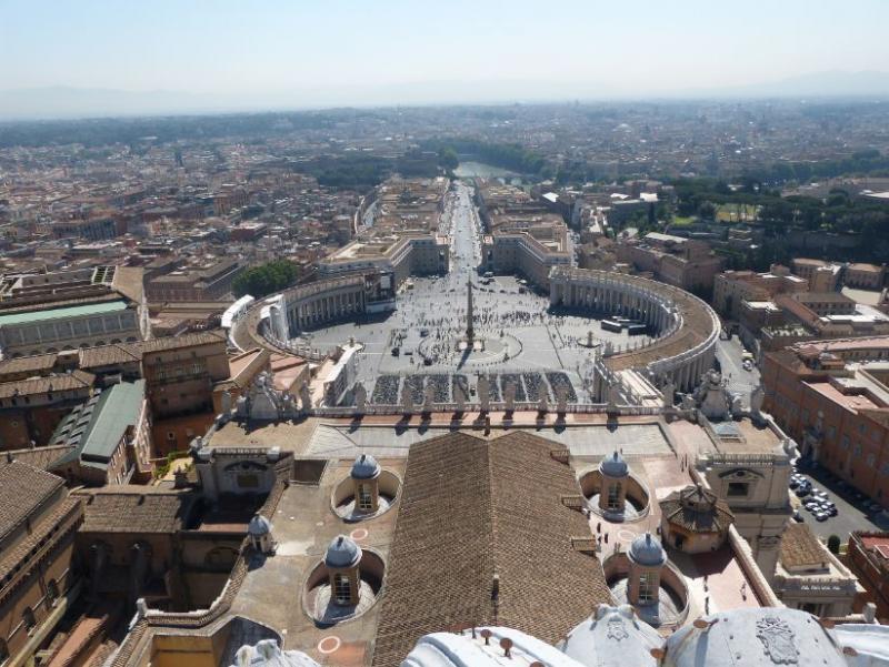 Sıra geldi bu ihtişamlı yapının kubbesine tırmanmaya. Kubbenin kilise haricinde ayrı bir girişi bulunuyor. En tepeye çıkmak için 2 seçeneğiniz var ya 320 merdivenin tümünü yaya olarak çıkacaksınız ya da asansörden faydalanacaksınız. Biz birkaç Euro daha fazla vererek asansöre binmeyi tercih ediyoruz ve belli bir noktaya kadar çıkıyoruz. Geri kalan yol tabana kuvvet : ) Merdivenler oldukça dar ve kasvetli. Üstelik dönen bir merdiven yapısı var. Klostrofobisi olanların bir kez daha düşünmesi gerekiyor. Söylene söylene merdivenleri tırmandık ama yukarıda manzarayı gördükten sonra o yorgunluğa sonuna kadar değdiğini hissettik. Hem muhteşem bir Roma manzarası hem de San Pietro Meydanı'nın ihtişamı bize görsel bir şölen yaratıyor.
