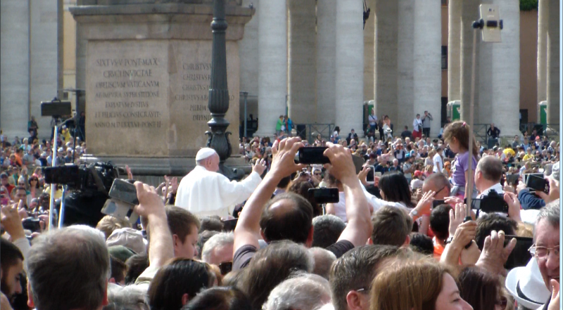 Şans o ki bir törene denk geliyoruz ve Papa Francis'in halkı selamlamasını görüyoruz. Meydan aşırı kalabalık dünyanın çeşitli yerlerinden gelen insanlar papalarını görmek için bekliyorlardı. Mikrofonlu biri, gelen cemaatleri tanıtıyordu. Bu kalabalıkta bazilikaya girmek imkansızdı ve biz de onu sonraya bırakıyoruz. Üstü açık bir araçla meydanda kalabalığın arasında dolaşan papaya şöyle bi el sallıyoruz ve müzeleri gezmek için meydandan ayrılıyoruz.