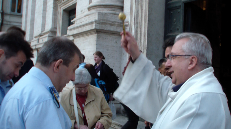 Piazza Venezia'ya doğru giderken Gesu Kilisesi karşımıza çıkıyor. Okul yıllarından ismini hatırladığım bu kiliseye giriyoruz hemen ve dini törene denk geliyoruz. Merak edip oturuyoruz ve töreni izliyoruz. Piyanolar eşliğinde ilahi okuyor, buhurdandan dumanlar tüterken kutsal suyla kutsanıyorlar. Tören bitince kilisenin önüne çıktık hep beraber ve bu suyla kapının önündeki arabaları kutsadılar, kimisi bisikletinin kaskını, kimisi yeni aldığı cep telefonunu uzattı pedere, o da kutsal sudan serpti hepsine. Bize çok ilginç geldi ve birkaç kişiye ne yaptıklarını sorduk ama çok İngilizce konuşamadıkları için biz de anlayamadık maalesef.
