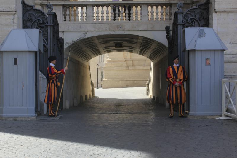 Bazilikadan çıkarken Vatikan'ı koruyan İsviçreli muhafızları görüyoruz. Oldukça ilginç üniformalarını Michalengelo'nun tasarladığı söylenir. Sarı, mavi ve kırmızı renklerinde değişik modelli bu formanın içinde kıpırdamadan duruyorlar. İnsan gözlerini ayıramıyor; böyle bir kostüm nasıl askeri üniforma olarak görülebilir. Tamamen kendi düşüncem ama benim aklıma sanatçının kiliseyle ve askeri düzenle dalga geçmiş olabileceği geliyor. Yoksa tiyatro sahnesinden fırlamış gibi bu adamların koca Vatikan'ı ve Papa'yı koruduğuna kim inanır değil mi ama? O kıyafetlerle çok tatlı değiller mi? :)
