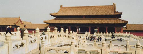 Şehrin tam ortasında uyum binaları var. Orta uyum binasında imparatorun 2 metre yükseklikteki tahtını görüyoruz. Bu bölgede 5 adet beyaz mermer köprü mevcut. Bu köprüler isimlerini Konfiçyus doktrinlerinden almış: Doğruluk – Zenginlik – Bağlılık – Akıllılık – Ölümsüzlük köprüleri. Bu köprülerden geçerek Meridyen kapısından Tianenmen meydanına çıkıyoruz. Yasak Kent’te yaşayan son imparator Pu-yi 1924’te burayı terketmek zorunda kalıyor. Tianmen meydanına çıkarken Mao’nun sırtının Yasak Kent’e dönük, meydanda ortadaki mozolede bulunan Dr. San Yen Sen’in portresine bakıyor (Anlamı imparatorluğu arkamda bırakıp, Çin Halk Cumhuriyeti kurucularından Dr. San Yen Sen’in izindeyim)