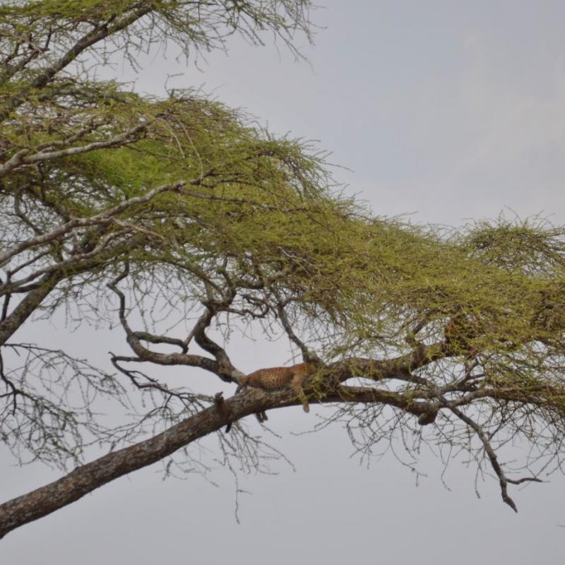 Yemeğimizin ardından safari turumuza devam ediyoruz ve rehberimiz bir ağacın üstünde leopar görüldüğünü söylüyor. Nereden biliyor derseniz; tüm safari araçlarında telsiz bulunuyor ve şoförler sürekli olarak birbirleriyle iletişim halinde kalıyorlar. Böylece birisi bir yerde ilginç bir hayvana ya da olaya rastladığında hemen diğerlerine bunu duyurabiliyor. Biz de bu gelen haberle beraber hızlıca oraya doğru yönümüzü çeviriyoruz ve nihayet Big 5 listemizde bulunan bir hayvanı daha görüyoruz. Leopar, savanada bulunan yırtıcıların belki de en utangaç olanı. Bu nedenle toprak üstünde görmek neredeyse imkânsız. Avını yakaladıktan sonra mutlaka bir ağacın dallarına çıkıyor. Hem avını burada tüketiyor hem de avına başka yırtıcıların ulaşmasını da engellemiş oluyor. Bizim gördüğümüz leopar yemeğini yeni yemişti sanırız ki kocaman bir göbeği vardı.