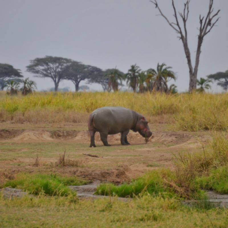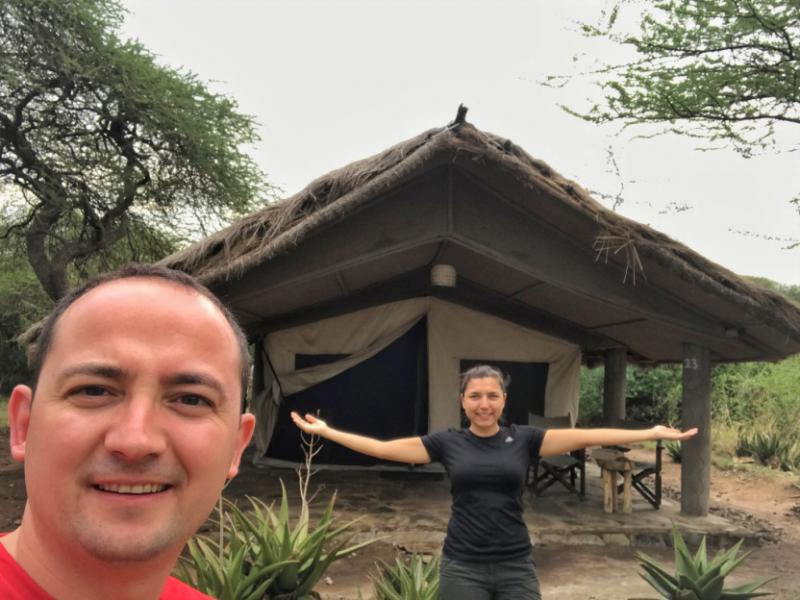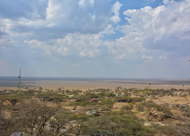 Bugünkü planımız; parka giriş yaptıktan sonra safari yapa yapa kalacağımız yer olan Serengeti Tented Camp‘e varmak. Bize oldukça farklı bir deneyim yaşatan bu kamp için ayrı bir bölüm ayırmamız gerekiyor sanırız. Öncelikle yaptığımız safari turumuz boyunca Milli Park’ın içinde kaldığımız tek yer burası oldu ve Milli Park’ın içerisinde olmanın getirdiği en önemli farklılık da kalınan yerin çevresinde herhangi bir çit, duvar gibi koruyucu bir şeyin olmaması. Yani çadırımız tam olarak savananın ortasındaydı. Tabii ki bu sebepten dolayı kamp alanımızda özellikle geceleri alanı koruyan silahlı korumalar bulunuyordu ve çok gelişmiş silahlara sahiptiler. Örneğin bir akşam yemeğe gitmek istediğimizde (etraf çok karanlık ve vahşi hayvan dolu olduğundan doğal bir yöntem) bize verilen düdüğü çaldık ve 3-4 dakika sonra bir koruma geldi. Elinde tam olarak bir ok ve yay vardı.