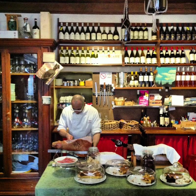 Zaman geçiyor, şarap zamanı. Hava biraz karardı. Yine Sagrantino'nun kollarına bırakacağız kendimizi. Yol üstünde ufacık bir kafeye giriyoruz. Duvarları tamamen şarap rafı, her şarabın üzerinde hikayesi...