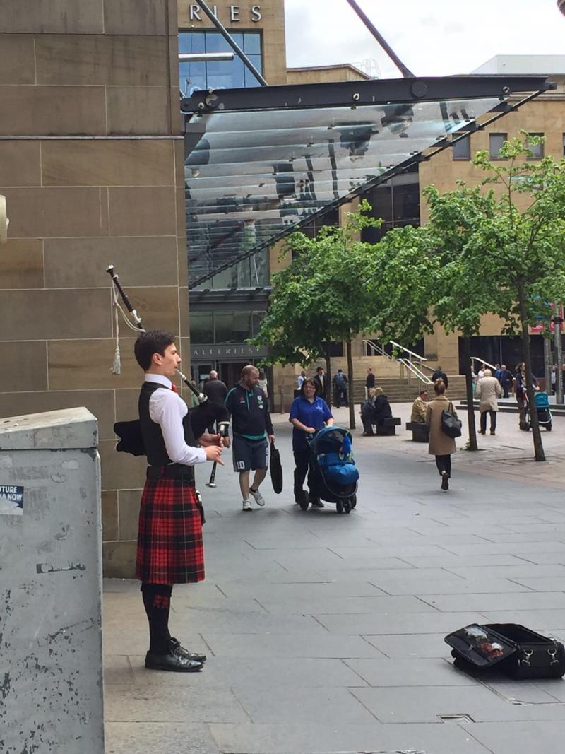 Son anda karar verdiğimiz Glasgow gezimizin ilk saatlerinde Glasgow Uluslararası Havaalanı`na indik. Şimdiden söylemek gerekirse, bu gezi sadece şehir merkezinin görüldüğü bir gezi değil; daha derin, daha tarih sevenler için. Havaalanı küçük ve şehre ulaşım çok kolay. Ya 10 dakikada bir kalkan ve 15 dk içinde şehre ulaşan ekspres otobüsler ile (7 pound kişi başı fiyatı, 2 kişi 13 pound); ya da 1 saatte ulaşan normal otobüsler (5 pound kişi başı, 9 pound iki kişi) ile ulaşabilirsiniz. Biz bir saatte gideni aldık. Çünkü şehrin içine girene kadar biraz normal yaşamı, dükkanları, evleri gözlemleme vaktimiz olsun istedik. Şehir merkezi olan Anderston`da bizi ilk karşılayan Gayda (backpipe) çalan ve Kilk giyen bu müzisyen oldu.