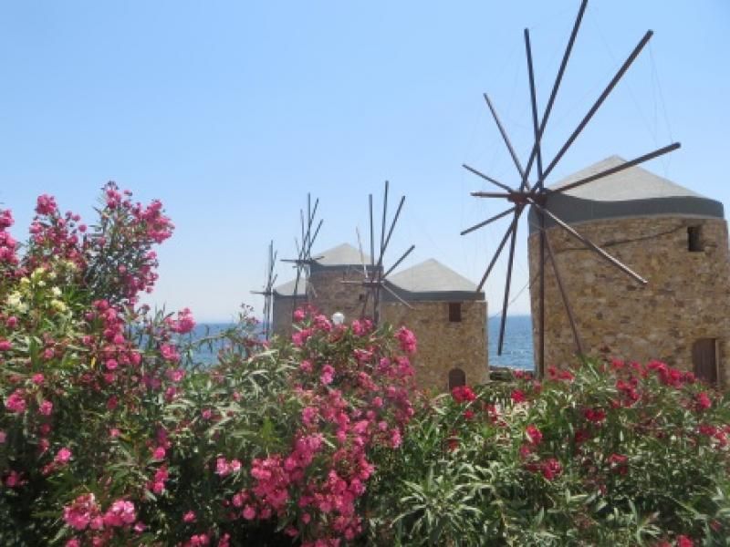 Tabii ki ben meraklı, hem etrafı incelemedeydim hem de göz ucu ile neler koyduğunu takip ediyordum. Taze taze getirdiği paskalya çöreği ve ekmekler nefis görünüyordu. Ekibimin de bana katılmasıyla açık büfede keyfimize göre kahvaltı yaptık. Hakikaten nilüfer çiçeklerinin ve kırmızı balıkların yüzdüğü küçük bir havuzun kenarında yaptığımız kahvaltı güzeldi ve 2 saat kadar sürdü. Niye acele edecektik ki… Bundan keyif alıyorduk, tatildeydik ve etrafımıza gelen Türk ve Fransız oda komşularımızla da sohbet ediyorduk. Saat 11.00 civarında otel tamamen boşalmıştı. Biz hala otel sahibiyle bir taraftan sohbet bir taraftan da kahvelerimizi yudumluyorduk. E artık kalkma zamanı geldi ve 50 € otel ücretimizi ödeyerek arabamıza atladık. Ver elini bu sefer adanın kuzey tarafı; Vrontados, Langada, Kardamila ve Pantoukios. Yine Chios’u arabayla sahilinden yani kordonundan dolaşarak geçtik ve kasaba çıkışında yel değirmenlerinin yanında durduk. Manzara, fotoğraf çekmeyi gerektiriyordu. Karşıdaki eski bir fabrika ve küçük bir kilise de dikkat çekiciydi.