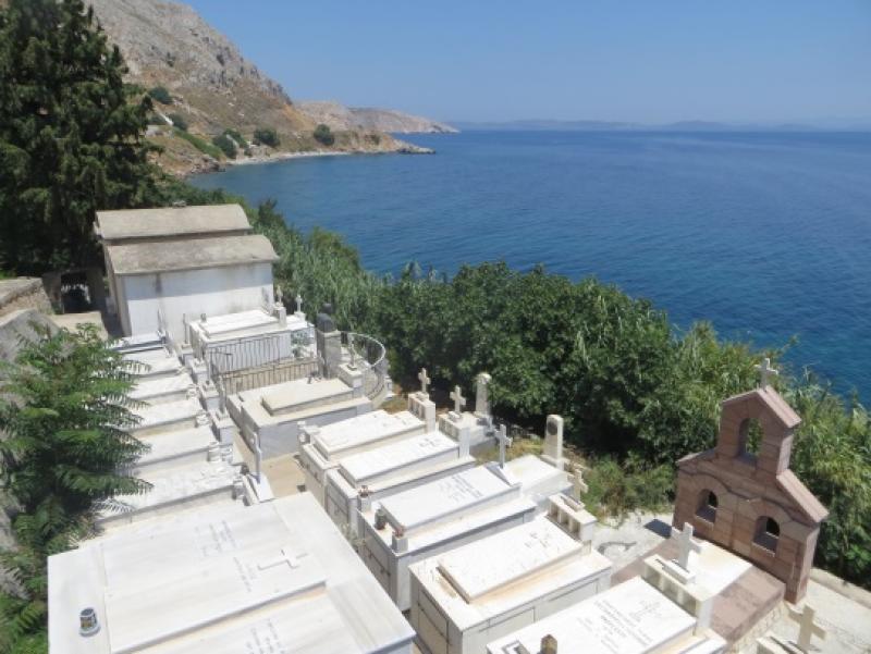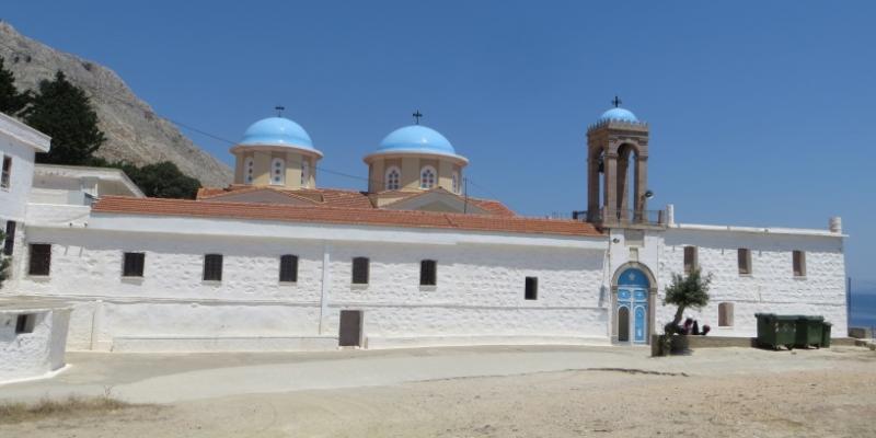10 km sonra ilginç bir manastır ve aşağıda plajı önümüze çıktı. Myrsinidi Manastırı’na gelmişiz. Burası 1897 yılında kurulmuş, 2. Dünya Savaşı ve Alman işgali esnasında yerlilerine şefkat ve yardımlarından övgüyle söz edilir. Güzel ve değişik mimarisi olan bu kilisenin hemen önünden inilen plaja, kilisenin mezarlığının önünden geçerek, demir attık. Tabii ki kiliseyi gezmeden olmazdı ama papaz içeriye girmemize izin vermedi. Bu arada kendini acı çekmeye adayan meşhur keşişleri Gregory V’in cübbesi de burada saklanmaktaymış. İşte sizleri kilisenin dış görünüşü, denizdeki yolcuları kiliseye çağıran ışıklı haç ve plaj manzaralarıyla sizleri baş başa bırakıyorum.