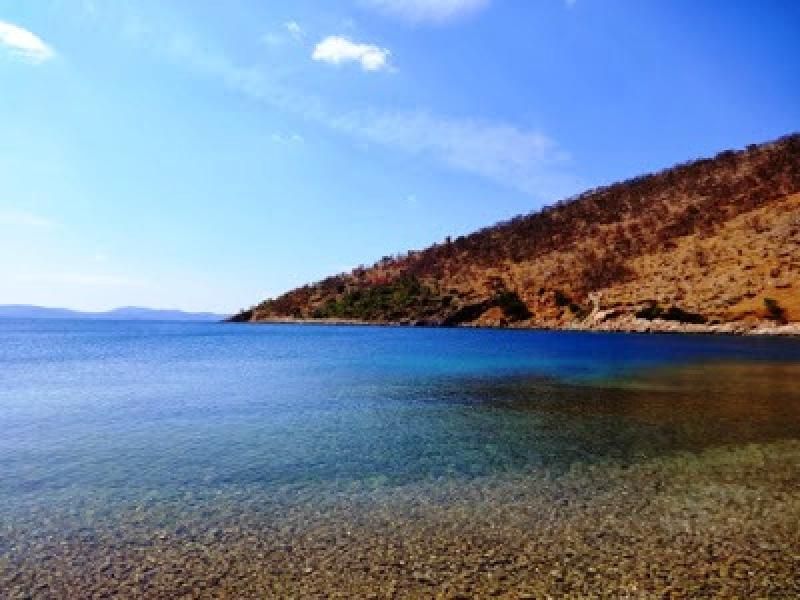 İlk durağımız dün güneş batmak üzere olduğundan tadını çıkaramadığımız, benim titreyerek denize bir girip çıktığım turkuaz deniz, üçgen kumsal Glari Beach. Kumsal bizim için rezerve edilmiş gibi kimsecikler yok.
