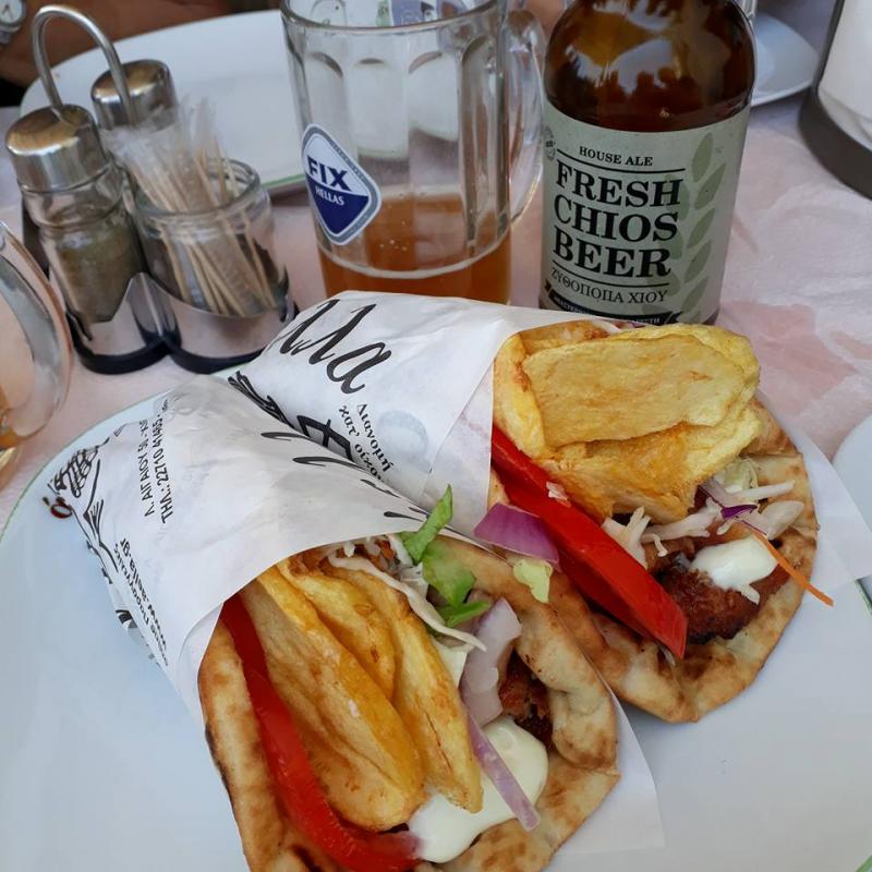 Gelelim Sakız Adası'nda ne yenir, ne içilir sorusuna... İlk gün Yunanistan'a özgü bir dürüm çeşidi olan, pideye sarılmış tavuk ya da domuzdan yapılan dönere cacıki, mayonez, hardal gibi soslar, patates kızartması konularak hazırlanan dürümden yedim; tabii yanında adaya özgü bira olan Chios Beer ile birlikte. Dürümün adı Gyros. Fotoğrafı aşağıda; bunu adanın merkezinde sahildeki kafelerden Aella'da denedim, denize karşı yemek güzeldi.