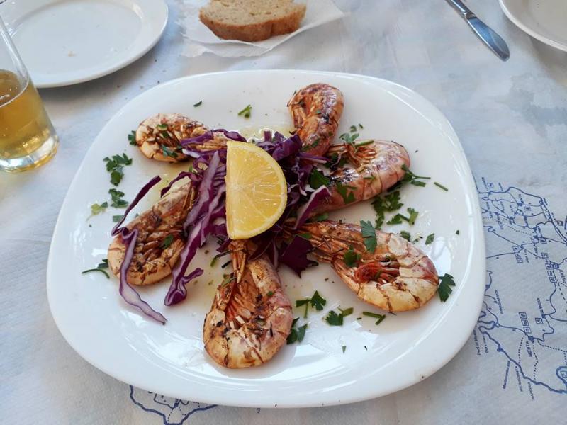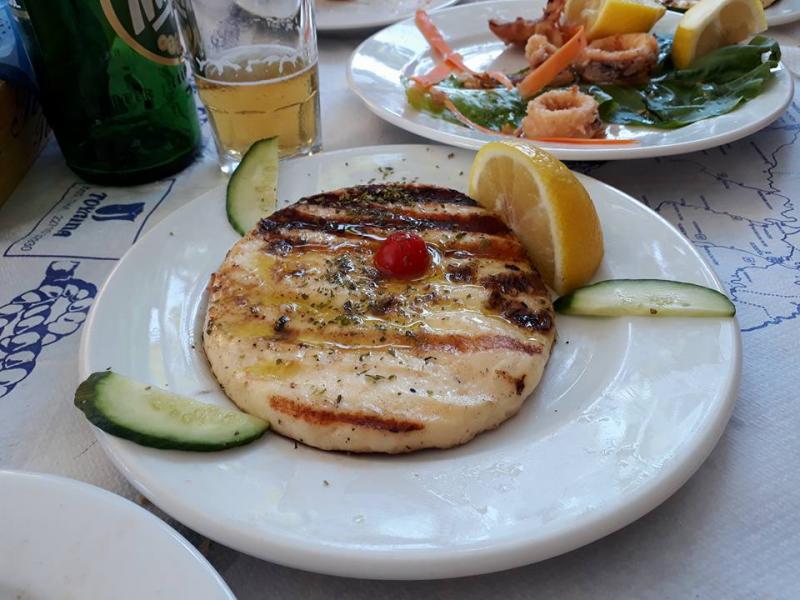 Tabii Yunan adasına gelmişken deniz ürünü yemeden dönülmez. Hem çok lezzetli hem çok uygun fiyata yemeniz mümkün. Kalamar, karides, balık, midye, Yunan salatası, Yunanistan'a özgü bir peynir çeşidi olan ve bizdeki hellime benzeyen Mastello (aşağıdaki yuvarlak peynir), içi peynirli üzeri parmesanlı muska börekler, cacıki, fava denediklerim arasında idi. Uzo da tabii ki masada yerini aldı.
