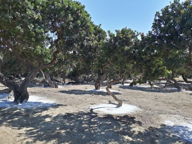 Yazımın son fotoğrafı da bu sakız ağaçları olsun. Altlarının beyaz kireçli oluşu damlayan sakızları rahat toplamak için. Toprağa yapışmasın diye böyle bir uygulama yapıyorlarmış. Sabah erkenden güneş görüp erimeden dökülenleri topluyorlar.