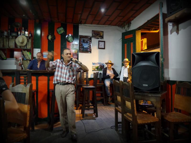 Cocora Vadisi'nin güzelliği ve saatlerce yaptığımız yürüyüşün yorgunluğu ile hostelimize geri döndük. Niyetimiz dışarıda bir şeyler atıştırıp gelip hostelde dinlenmekti ama öyle olmadı. Tesadüfen gördüğümüz ve biraz müzik dinleyelim diye bir masaya iliştiğimiz mekandan son ayrılanlar olduk. Amcam gelmiş mekan sahibine burada müzik yapabilirmiyim demiş, kocaman hoporlörü, cd’leri ve elinde de kumandasıyla bütün gece karaoke yaptı.