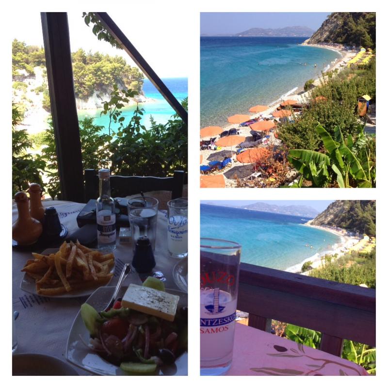 Zaten büyük büyük plajlardansa minik minik, kumsalın yanı başında tek bir tane lokal bir tavern’in olduğu plajları hep daha fazla tercih ediyoruz. Psili Ammos yolu üzerinde gördüğümüz bu tarz bir tavern önü plaja konuşlanıyoruz. Bu arada tavern bildiğiniz restoran demek Yunanistan’da. Öyle canlı müzik, tabak kırmaca falan yok yani. Öyle tavernler de var da onlar canlı müzikli tavern : ) Deniz molası sonrası Grek salata ve uzomuza bu sefer kalamar eşlik ediyor.