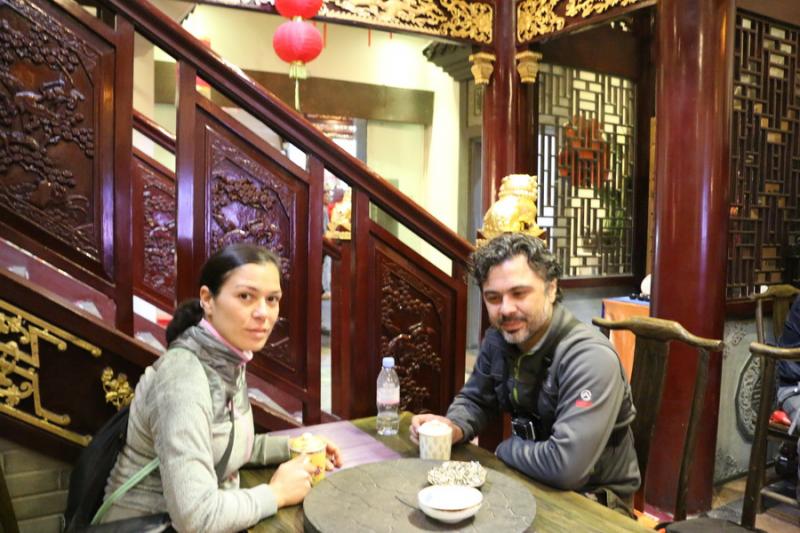 Bu tapınağın içinde ayrı bir bölümde Çin çayı içebileceğiniz küçük bir alan var. Önce siparişi verdik, çay geldi. Birimiz yeşil çay, birimiz yasemin çayı istedik. Ama su bittikçe yenisini getiriyorlar. Bu çay seremonisi bizim için bitmek bilmeyen çaya dönüştü. Fiyatı ise bir hayli yüksek. Hatırladığım kadarı ile 2 kişi 25-26 TL’ye denk gelecek Yuan ödedik.
