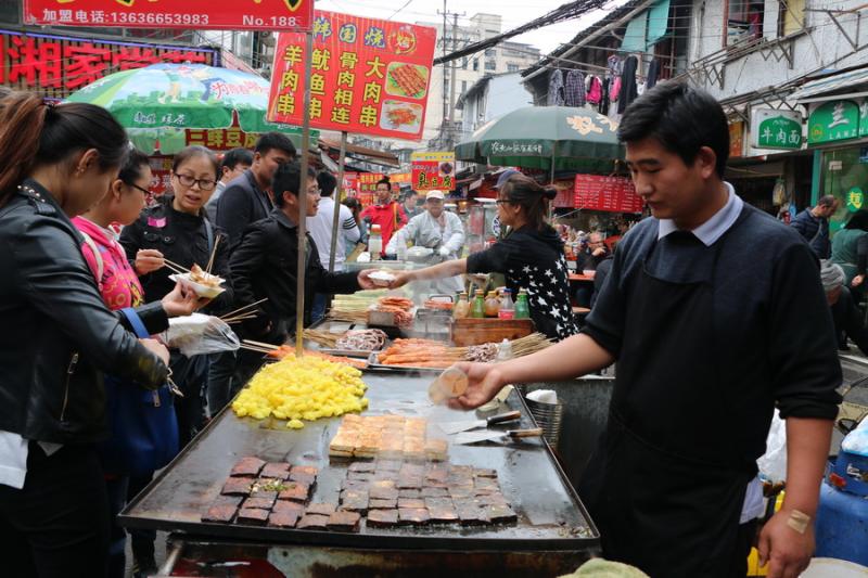 Yine buradan sonra Chenghuangmiao Tapınağı’nın etrafındaki ara sokaklara giriyoruz. Bu sokaklarda tamamen Çin’e özgü lezzetler satılıyor.