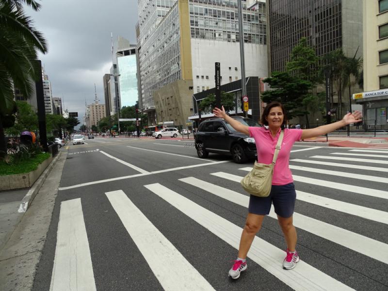 Müze sonrası, Sao Paulo’nun en büyük caddesinde biraz yürüdük ve ayrılma vakti geldi. Anita ve ailesine veda ederek ayrıldık. Elimizdeki harita ile Paulista Caddesi’ni arşınlamaya başladık. Renkli görüntüler, canlı bir bölgede hoş bir gezinti yaptık. Sokakta para toplamak için gösteri yapan lastik adamlar oldukça ilginçti. Burası aynı zamanda en modern binaların, en önemli merkezlerin, en güzel kafe ve restoranların olduğu cadde. Caddenin orta refüjü bisikletlere ayrılmış. Çok da güzel olmuş. Bisikletliler özgürce tüm caddeyi baştan başa gezebiliyorlar.