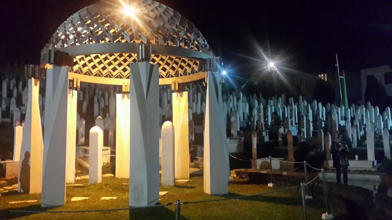 Akşam şehir merkezine gittik. Bu arada şehir içinde ulaşımda kullanılan metro bizim yıllar önce kullandığımız kara trenler gibi. Bir anda uçağın pistten havalanacağı anki gibi tıkıtılar hissediyorsunuz, sonra birden sağa sola yalpalanıyorsunuz. Gürültülü bir yolculuk sonrasında Başçarşı’ya gittik. Önce bağımsız Bosna-Hersek’in ilk cumhurbaşkanı Aliya İzzetbegoviç’in mezarını ziyaret ettik. Şehrin bir çok yerinde de mezarlıklar görüyorsunuz. Beyaz taşlı olanlar Bosnalılar’a, siyah taşlı olanlar ise Sırplar’a ait. Mezar ziyaretimizin ardından nargile keyfi yaptık. Geleneksel biralarının tadına bakmayı da ihmal etmedim. Tadı güzeldi.