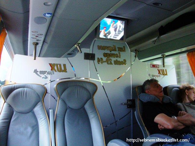 • İki gün göz açık kapayana kadar geçti, Riga’ya otobüsle geçeceğiz.. Otobüs biletimizi birinci sınıf aldık, otobüs ortadan camla ayrılmış; birinci sınıf arka tarafta, masamızda ikram olarak su/kuruyemiş ve 80’lerden kalma klipler gösteren televizyonumuz var.