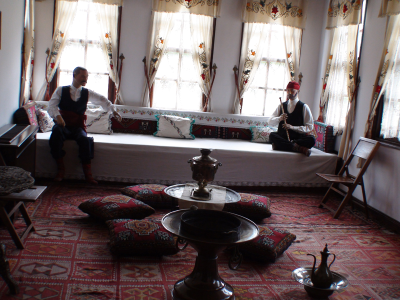 Daha sonra Hazeranlar Konağı (Etnografya Müzesi)’na geliyoruz. Konak, 1865 yılında nehir kenarında Roma dönemi sur duvarları üzerine kurulmuş. Osmanlı döneminin en zarif sivil mimari örneklerinden biri. Konak haremlik-selamlık olarak düzenlenmiş. Osmanlı yaşam tarzı gayet güzel bir şekilde tasvir edilmiş. Konaktaki tavan ve dolap kapakları ile raflardaki bezemeler dikkat çekici güzellikte.