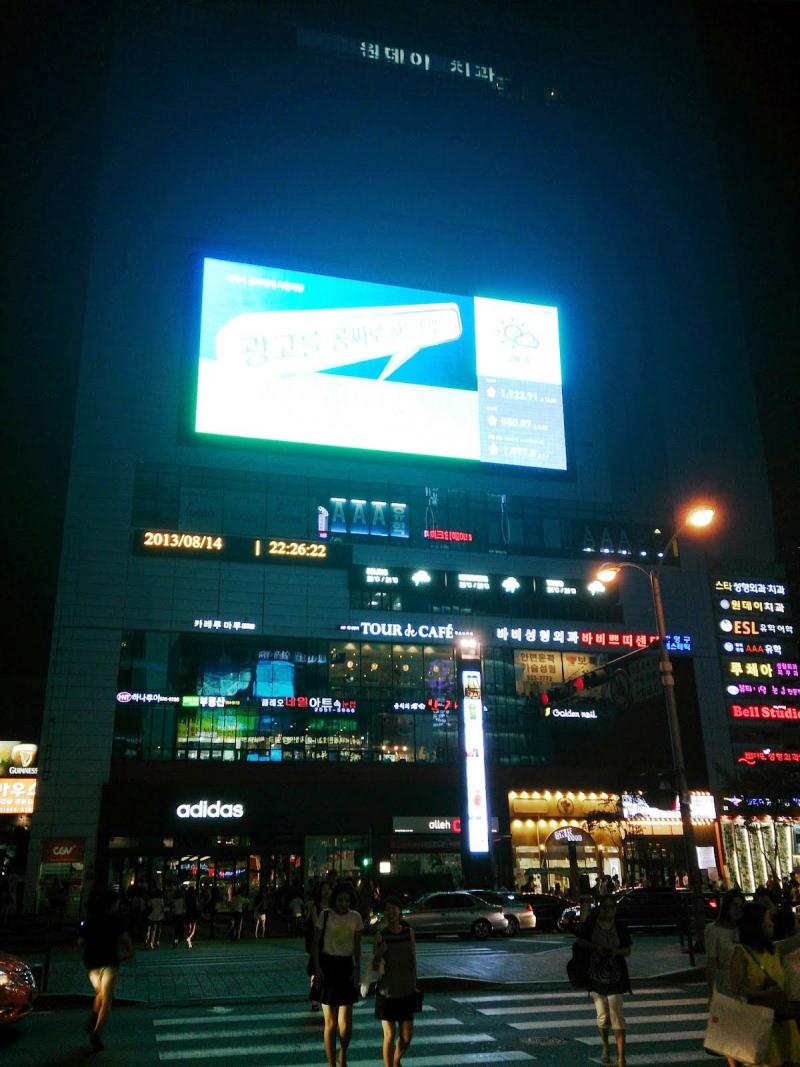 Eşyalarımızı yerleştirip biraz dinlendikten sonra etrafa göz atmak için dışarı çıkıyoruz. Etraf kocaman ve muhteşem mimarisi olan binalarla dolu. Ayrıca birçok binada kocaman led reklam panoları var. Güney Kore'nin dünyanın en büyük led üreticisi olduğu her halinden belli oluyor : )