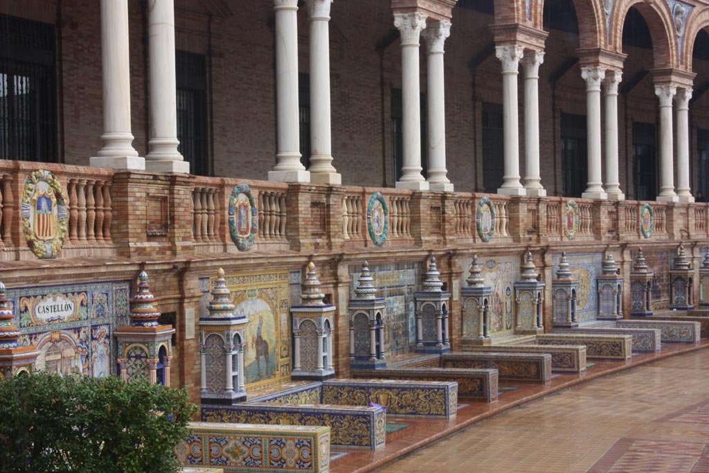 Sevilla’nın en etkileyici yerlerinden biri belki de yarım ay şeklinde tasarlanmış olan İspanyol Meydanı. Bu yapı ilk olarak İspanyol pavyonu olarak inşa edilmiş. Buradaki iki katlı bina, Günümüzde Sevilla Üniversitesi ve Endülüs Özerk Bölge Yönetimi hizmet binaları olarak kullanılıyor. Ortasında da güzel ve genişçe bir süs havuzu var. Bu binada kafanızı sütunlardan uzatıp, sağa ya da sola baktığınızda göreceğiniz ritim etkileyecek. Bazı gelin ve damatlar evlendikleri gibi burada fotoğraf çektirmeye geliyorlarmış. Hava şanssızlığımıza yağmurlu olsa da, burada 3 farklı yeni evlenen çifte denk geldik. Bu meydanın diğer ilgi çekici yanı ise tarihi olayların betimlemesini yapan seramiklerdi. Endülüs bölgesinde zaten bol miktarda seramik göreceğiz. Arabistanlı Lawrence ve Star Wars filmlerinin bazı sahneleri burada çekilmiş.