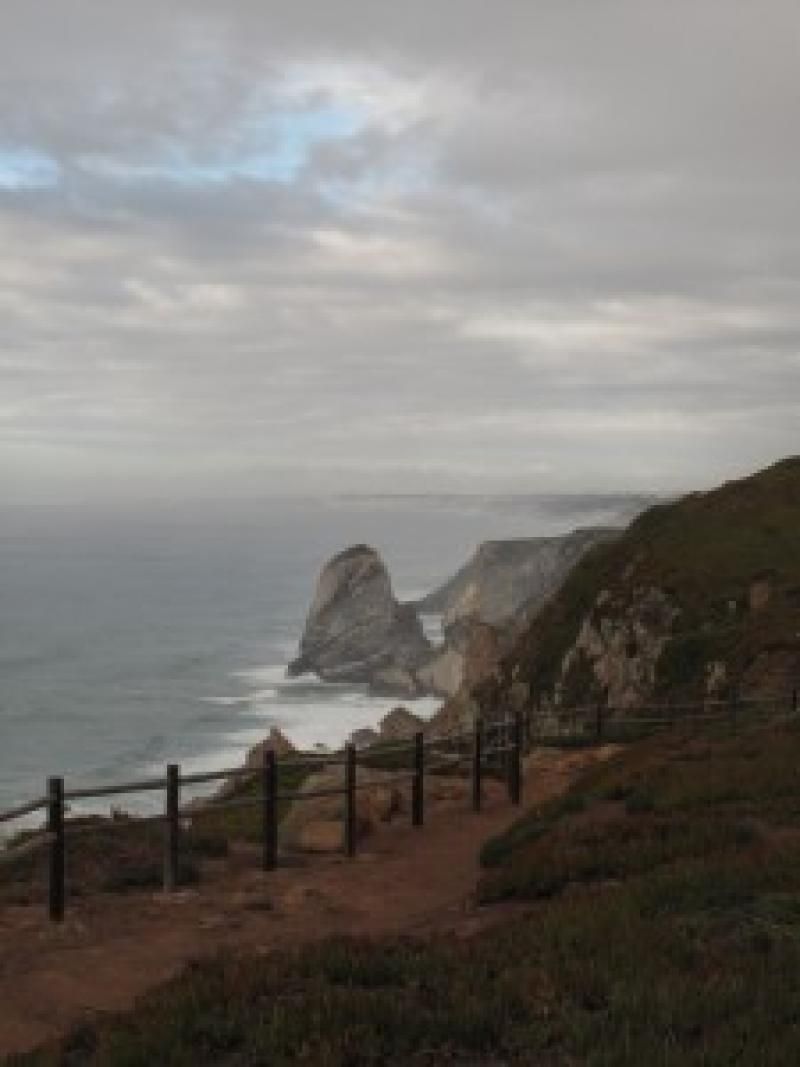 Ufuklar sakin görünüyor ama, kıyılarda kayalara çarpan dalgalar, okyanusun gücünü ve kızgın yüzünü gösteriyor. Çarpan dalgaların oluşturduğu, su buharından oluşan ince sis perdesinin arkasında, daha kuzeyde kalan yerleşimler Portekizin sahil kasabaları. ( Praia dos Maços, Azenhas do Mar ) Güneyde ise, uzakta Cabo de Raso Burnu seçiliyor, Portekiz’in güney köşesi.