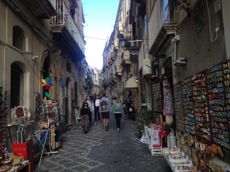 Gezimizi bitirmek için acele etmiyoruz, daha çok zamanımız olduğu için geri dönüp bu kez ara sokaklara girip çıkmaya başladık. Sicilya kentlerinde çok sık göreceğiniz dar sokaklar, çamaşırlı ve çiçekli balkonlu evler burada da çok güzel görüntüler oluşturuyor. Kafamıza göre sokaklara girip çıkıyoruz ve onlarca fotoğrafla yine pınara geliyoruz.