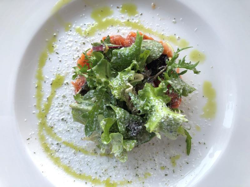 Önden gelen aperatifler yiyeceğimiz enfes yemeklerin işaretçisi oldu. Başlangıç olarak füme somonsalatası, ardından gelen buhardapişirilmiş kuzu eti muhteşemdi. Yanında tabii ki bölgeye has beyaz şarap.