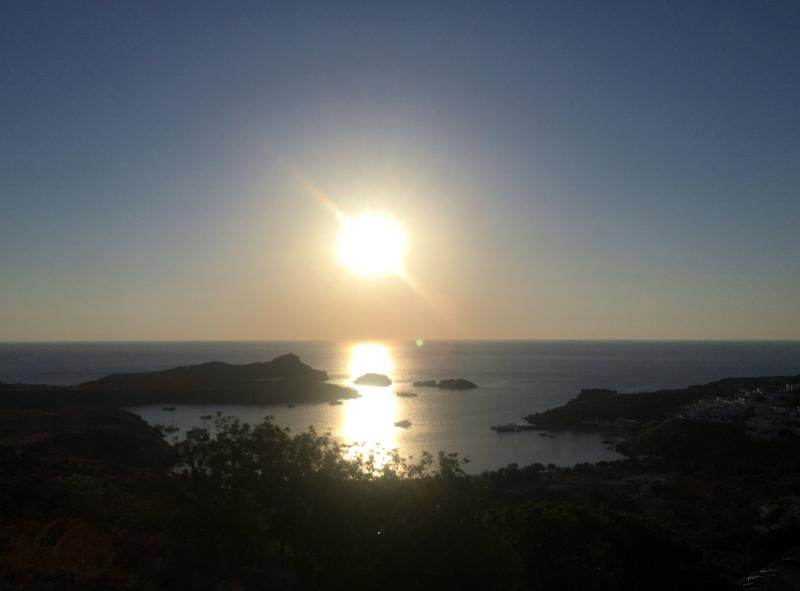 Rodos'un çok büyük bir ada olduğunu söylemiştim, bu sebeple konaklamak için çok fazla seçeneğiniz olacak bölge olarak. Biz bölge olarak seçeneği ikiye indirdik kafamızda gitmeden once; Old Town denilen Eski Şehir merkezi ya da Lindos denilen turistik bölgede kalacaktık. Ancak her iki bölgede konaklama seçenekleri çok pahalıydı. Biz de Lindos'a 3 kilometre mesafedeki Pefkos'ta bir apart otelde konaklamaya karar verdik. Temizlik ve konum olarak çok memnun kaldığımız belirtmek istiyorum, Rodos'a gidecek olanlara kesinlikle öneririm, buradan otele ulaşabilirsiniz. Otel odamızın balkonundan gün batımı manzarası muazzamdı.