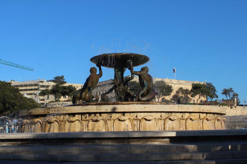 Valletta şehrine ana otobüs terminallerinin bulunduğu, ortasında Trition Çeşmesi’nin yer aldığı büyük yuvarlak bir park alanından giriyoruz. Trition çeşmesi oldukça görkemli ve içinde devasa heykeller var.