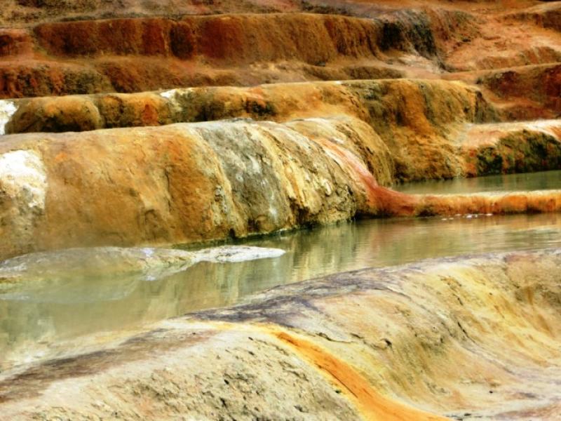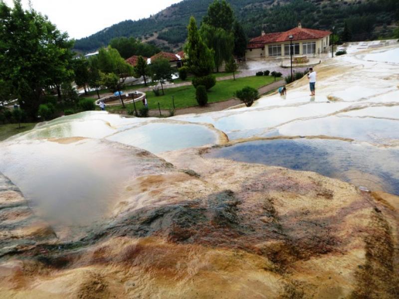Tam sezonu başlamadığından mı nedir haziran ayında bile burası boş diyebilirim. 3-5 turist otobüsü var, ama böyle bir Dünya Miras Listesinde olan yer için bu kalabalık çok az. 2 saatimizi de burada geçirdikten sonra 5 km. ilerideki Karahayıt Köyü’ne kırmızı taş ve şifalı içme sular ülkesine gidiyoruz. Ne kadar garip değil mi? 5km ileri gidiyorsunuz, bir başka güzellik bir başka renk ve bir başka medeniyetle karşılaşıyorsunuz. İşte bu Türkiye’nin kıymetini bilmeyenlere yuh olsun. Burası da şifalı içme suları ve romatizma ve sedef hastalıklarına iyi gelen şifalı suları ile tanınıyor. Burada birçok kalınacak otel, motel ve pansiyon var. İsterseniz 1 gece burada kalıp bu sıcak sularda keyfinize bakabilirsiniz. Ama gerçeği söylemek gerekirse burasını biraz perişan buldum. Birisinin buraya, bu hazineye sahip çıkıp, el atması gerekiyor.