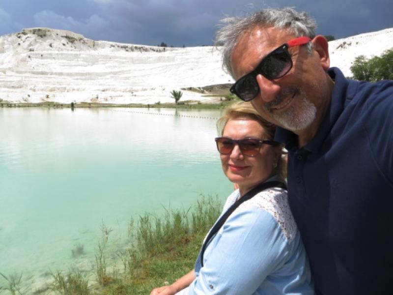 Üzerine de tahinli ballı pide, tatlı niyetine gelmez mi? Bu güzelliği 3 bardak çay ancak hazmettirdi diyebilirim. İşte artık bu yemekten sonra ya kırk adım atacaksınız, ya da sırt üstü yatacaksınız. Öyle derler değil mi? Biz kırk adım, hatta daha fazlasını atmayı seçtik ve haydi bakalım Pamukkale’ye gidiyoruz. 20 dakikalım bir yolculuktan sonra Pamukkale Milli Parkı’na geliyoruz. Aracımızı park ettikten sonra ilk olarak, travertenlerin hemen aşağısında bulunan parkı geziyoruz. Burası insana gayet güzel bir traverten manzarası sunuyor ve şifalı suların da buraya akmalarından dolayı, oluşturulan gölde yüzen balık ve ördekler eşliğinde iyi bir dinlence yeri olmuş.