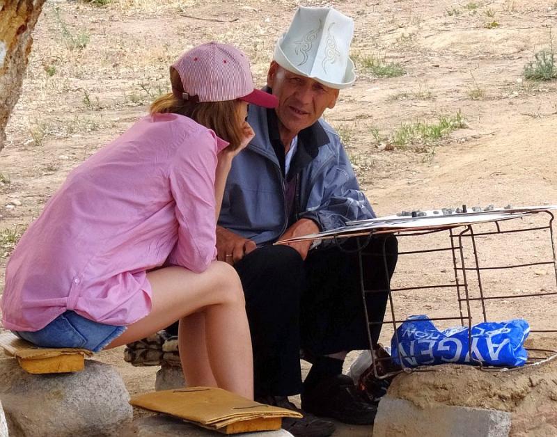 Artık karnımız acıktı ve dört başı mamur bir Kırgız yemeğini hak ettik. Neyse ki ev sahiplerimiz bizim onurumuza bir yemek verecek ve yöre mutfağının değişik lezzetlerini deneyeceğiz; at, koyun, inek, Allah ne verdiyse... Yemek için öyle bir sofra hazırlanmış ki, bir tek kuş sütü eksik. Kuş sütü olmasa da, at sütü masamızda yerini alıyor. Kımız, yani fermente edilmiş ekşi ve alkollü at sütü. Kefir’e benziyor, zaten benzer şekilde elde ediliyormuş; yani belli bir mikroorganizma grubunun faaliyeti sonucu.