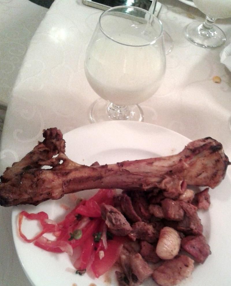Tabaklarca meze, at, dil, ve sairenin ardından bir et tabağı geliyor. Ama ne tabak... Gergedan uyluğu boyutlarında bir kemik ve kemik ile organik ilişkisi olan bir et yığını zaten doymakta olan bünyemize sunuluyor. Ama öyle güzel pişirilmiş ve lezzetli bir et ki kapasiteyi zorlayıp tabağı sıyırıyoruz.