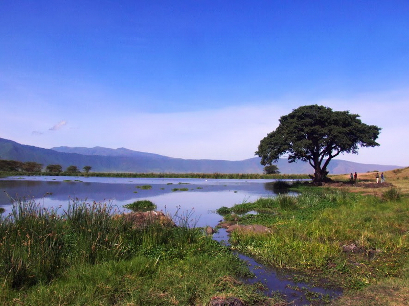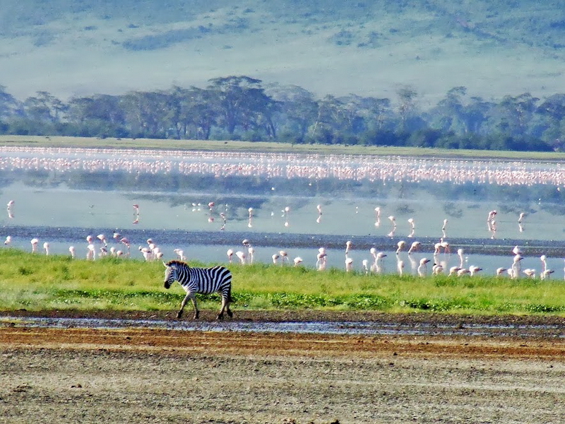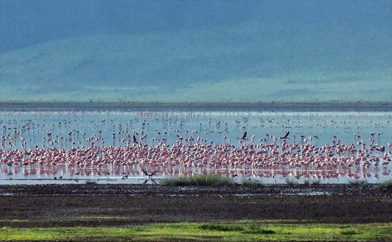 Tanzanya’nın kuzeyinde, karmakarışık bir bitki örtüsü altına gizlenmiş olan, deniz seviyesinden yaklaşık 1.800 metre yükseklikteki bu antik ve çoktan sönmüş volkanın sarp yamaçları krater duvarlarının içinde neler döndüğüne dair çok az ipucu verir. Tek odak noktası, pembe lekeli havuzlar etrafında pırıl pırıl dönen, yaklaşık 600 metre aşağıdaki gümüş işlemeli su yollarıdır.
