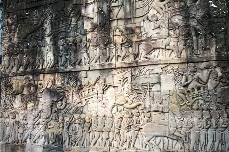 Bayon Tapınağı: Tabii ki önceliği tapınakların en önde gelenine vermeli. Burası şehrin tam merkezinde yer alıyor ve zamanında imparatorluğun resmi tapınağıymış. 3 katlı, 54 kuleli ve kulelerinde de “Big brother is watching you” şeklinde, fakat belli belirsiz bir gülümseme ile sizi izleyen 200 kadar devasa yüz tasviri var. Bir de duvarlarındaki kabartmalar, Angkor’daki tüm tapınaklarda olduğu gibi harika.