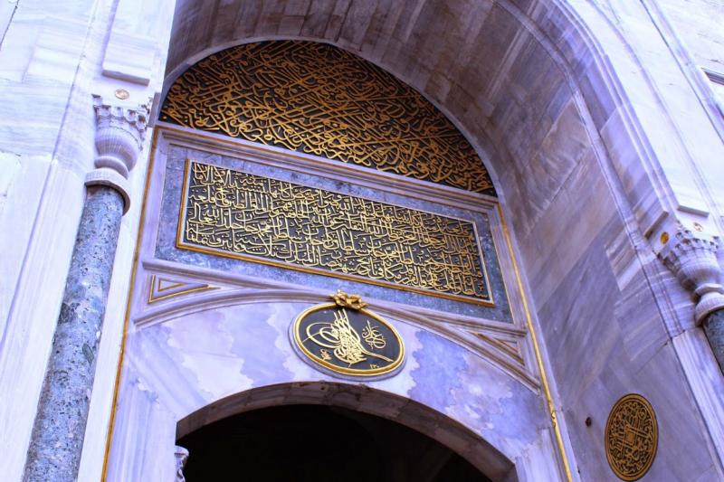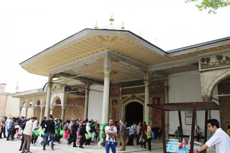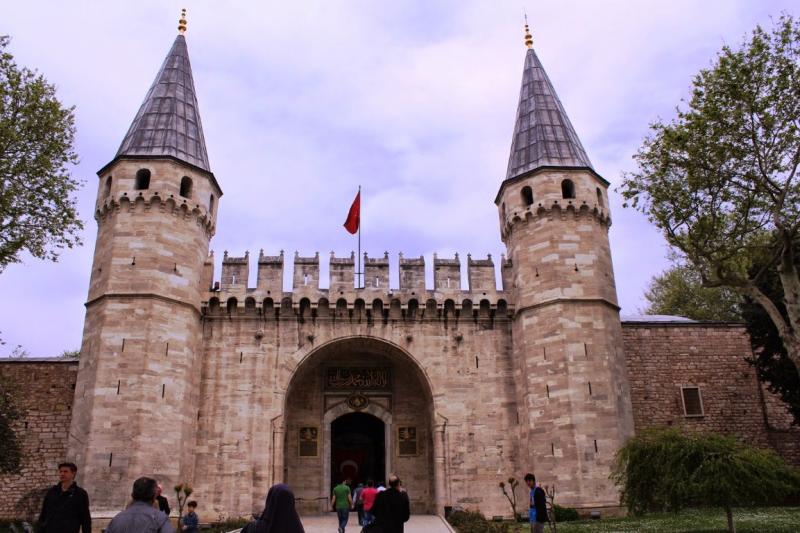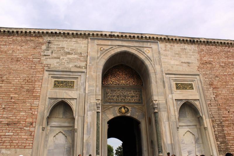 Ziyaretçiler saraydan içeri Ayasofya'nın tam karşısındaki Bab-ı Hümayun'dan geçerek giriyorlar. Tam karşısına geçip baktığınızda hemen üzerinde hat sanat harikası bir kitabe görürsünüz. Hemen altında ise Fatih Sultan Mehmed sarayı yaptırırken konan kitabede: "iki kıtanın sultanı ve iki denizin hakimi" yazıyor (alıntı: Saffet Emre Tonguç)