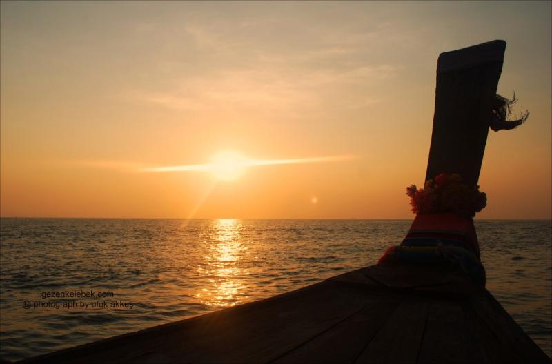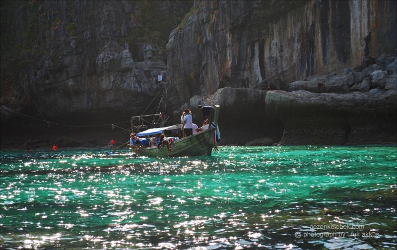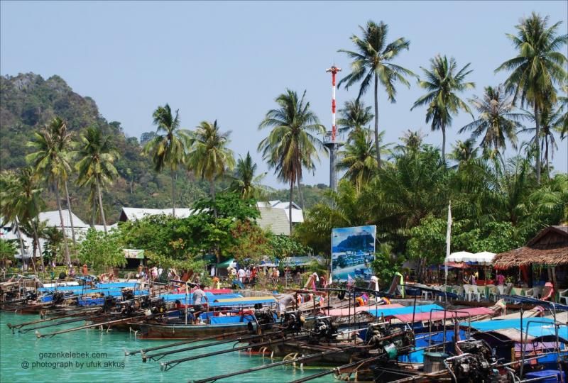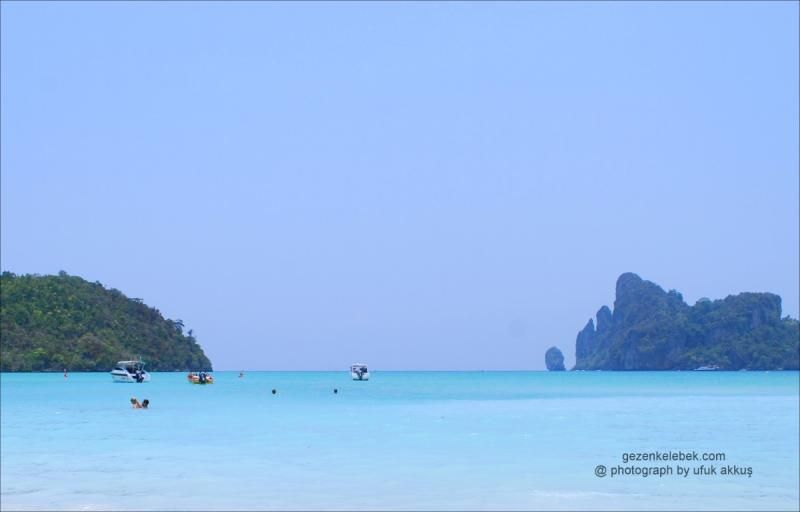 Sabah 6.30'da kalktım ve hazırlandım. 7'de otelden bir minibüsle alınarak Phuket Town’da bulunan vapur iskelesine geldik. Buradan da büyük ve lüks sayılacak bir tekneyle Phi Phi adalarına yolculuk başlıyor. Phi Phi Adası ünlü aktör Leonardo Di Caprio’nun The Beachfilmini çektiği filmiyle ünlenmiş bembeyaz kumları ve turkuaz renkli deniziyle yeşillikler içerisinde tropik ve küçük bir ada. Phuket’ten yolculuk tekneyle 1.5 saat sürüyor. Phi Phi adasına geldiğinizde adaya giriş ücreti olarak 20 Baht veriyorsunuz. Yaklaşık 1 TL gibi ucuz bir rakam. Adanın görünümü muhteşem. Otel bulmakta zorlanmıyorsunuz, iskeleden çıkarken girişte otel ve turlar için sizi bekleyen satıcılar var. Yine sırt çantalı turistlere göre hesaplı bir otel buldum. Merkezi bir yerde ve her tarafa yakın. Sahile ve iskeleye 100'er metre yok. Yine ben doooğru denize.