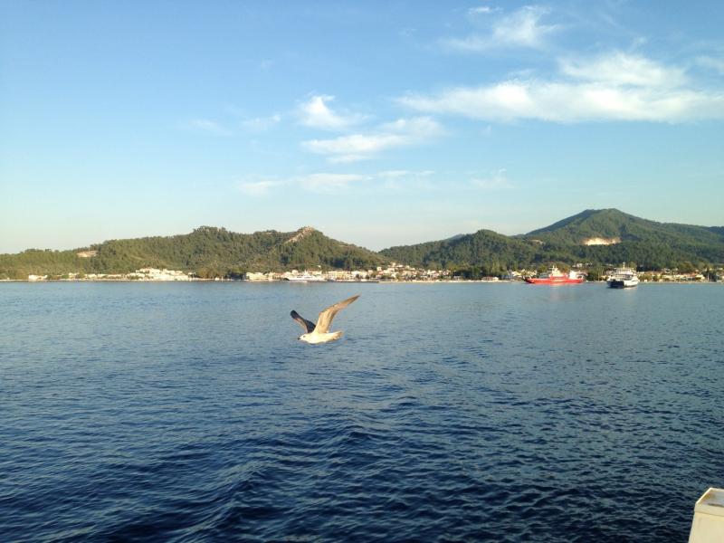 Feribot ile adaya yaklaştıkça yeni bir Yunan adası ile buluşmanın heyecanı kaplıyor içimizi. Adaya vardığımızda beni en çok etkileyen şey adanın yeşilliği oldu. Çünkü diğer çoğu Yunan adasının aksine bu ada yemyeşil ağaçlarla kaplı.