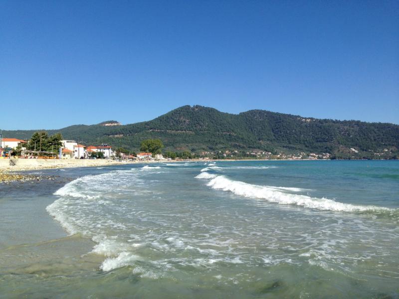 Burada denize girmedik ama bölge hoşumuza gitti. Hemen internetten yakınlarda otel baktık. Bu bölgedeki konaklama seçenekleri daha çok aileler tarafından işletilen pansiyonlar. Skala Potamia bölgesinde küçük, sevimli bir pansiyon bulduk, rezervasyon yaptık. Kahveleri bitirir bitirmez pansiyona geçtik. Yeri de süper. Golden Beach’in en güney ucunda. Odadan denize yürüme süresi sadece 1 dakika.