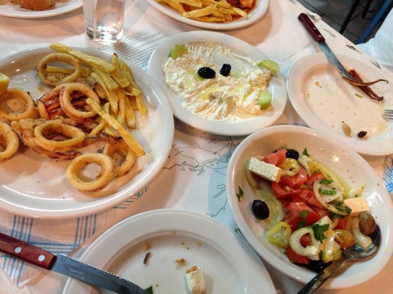 Artık ilk gece başımızı sokacağımız yer belli olduğuna göre valizleri bırakıp gezmeye başlayabiliriz. Tabii önce yemek faslı. Skala Potamia çok sevimli bir bölge. Ne çok kalabalık ne de çok sakin. İlk olarak deniz kenarındaki restoranlardan birine geçtik. Epey de açız. Hemen meze olarak cacıki, kabak çiğeği dolması, fava, feta saganaki, yunan salatası ve ahtapot söyledik. Garson hayretle baktı ve “Hepsi mi?” diye sordu. “Evet” dedik.
