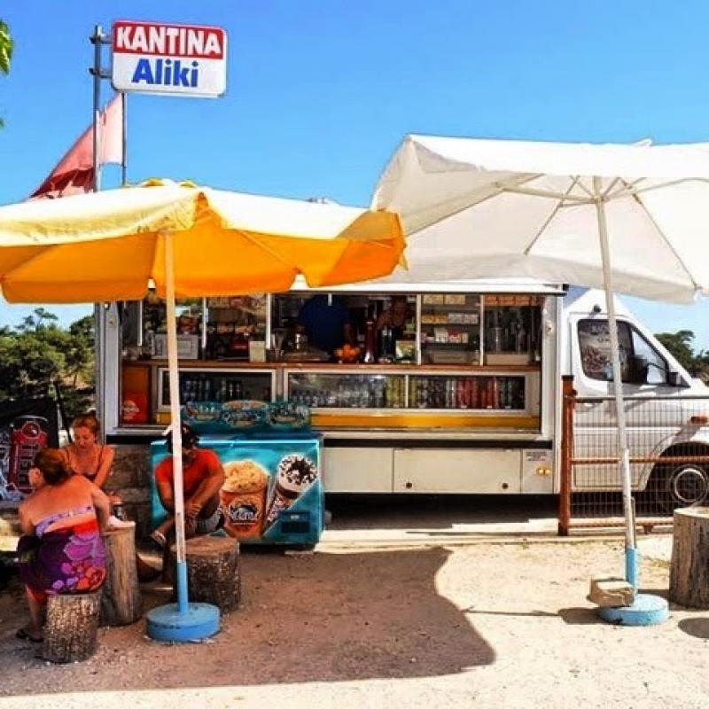Bu sefer öğle vakti uzo sofrası kurmayalım diyor, çocuklar arabada uyurken biz de Aliki'nin tepesindeki karavan büfe Kantina Aliki'de Mytos eşliğinde pita ekmek arasındaki patates ve Yunan köftesi “sucukaki”leri götürüyoruz. Şimdi deniz zamanı...