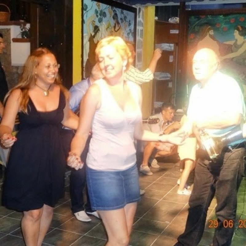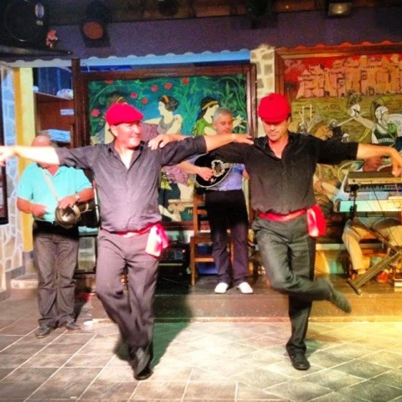 Sahnede tonton Yunanlardan oluşan bir ekip yerel halk danslarından figürler sunuyor, restoran sahibi Augustos bizzat sahneye çıkıp şarkı söylüyor.